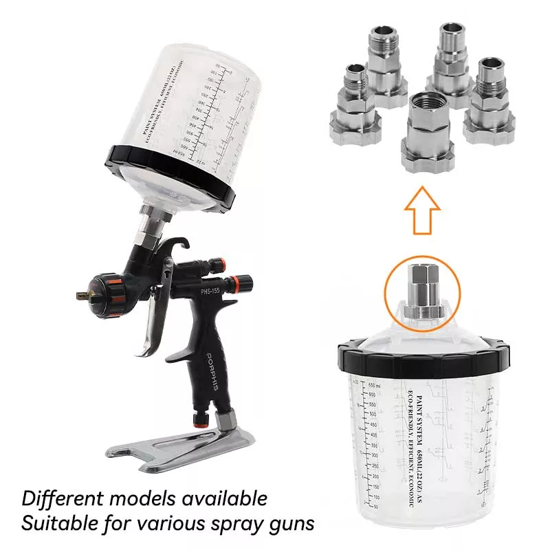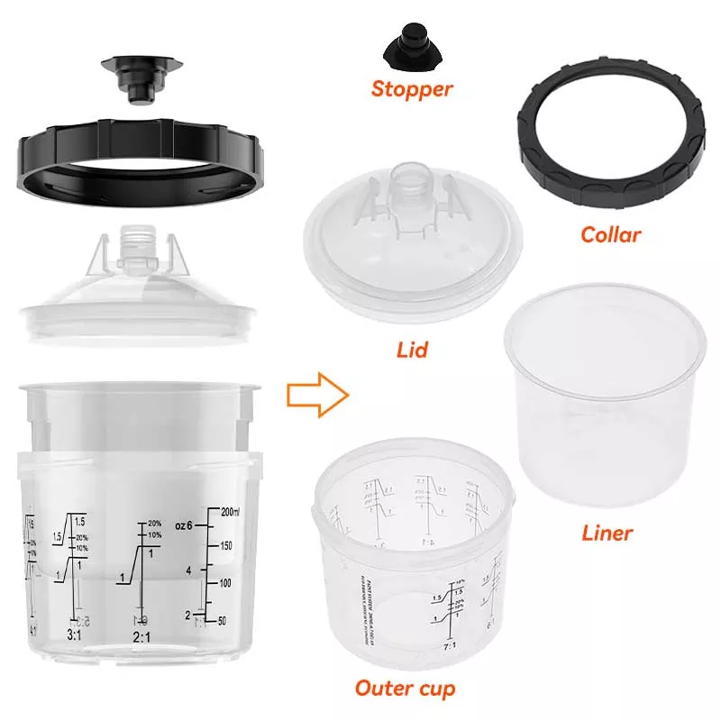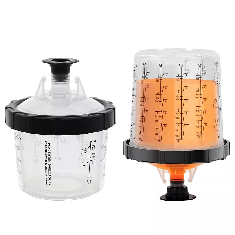 Тази система за чаши за боя за еднократна употреба 1.0 от 200 мл основно замества традиционната чаша за гравитационно подаване, защото не само спестява повече боя, но и подобрява ефективността на боядисването. По-конкретно, изящният дизайн на автоматичната спирала на лайнера при боядисване прави боята напълно използвана; междувременно дизайнът за бързо заключване плюс смяна на обшивката избягва измиването на чашата, което позволява боядисването да се извършва ефективно и многократно. Имаме адаптери за почти всички марки пистолети за пръскане на пазара, за да отговорим на нуждите от опит на различни ентусиасти на пистолети за пръскане. Адаптерът е изработен от неръждаема стомана, която е устойчива на корозия на боята и много издръжлива. Плътната комбинация на подложката с капака гарантира, че системата за чаши не изпуска боя по време на боядисване и поддържа дълготрайно съхранение на неизползвана боя, за да се избегнат отпадъци.