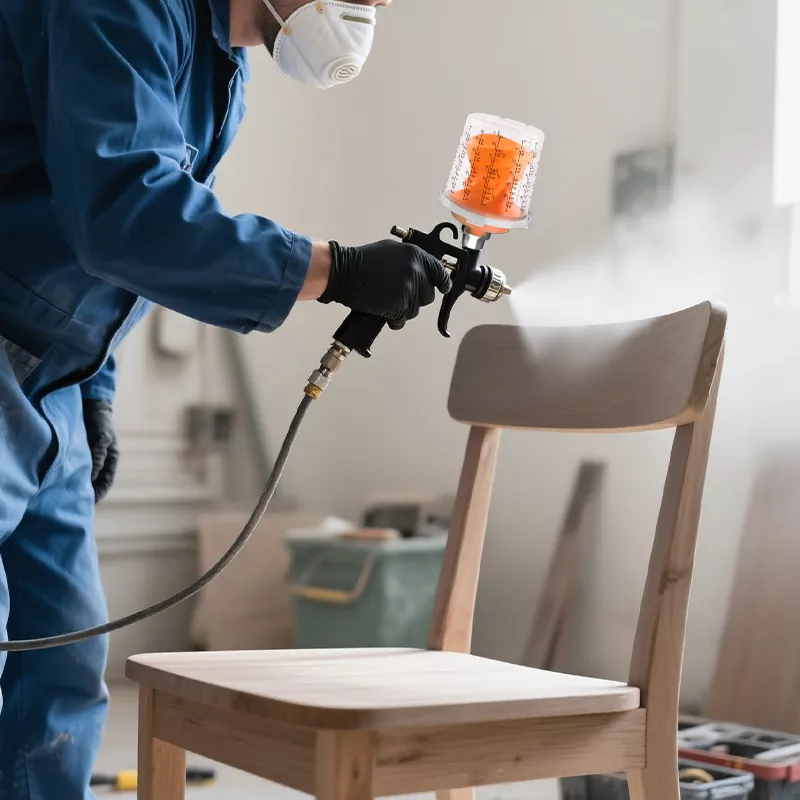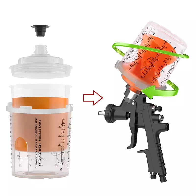 Прозрачният дизайн на чашата улеснява наблюдението на останалата боя. Чашата за спрей за еднократна употреба гарантира, че пистолетът за пръскане може да напръска 360 градуса без изтичане на боя, което може да замърси повърхностното замърсяване на дървесното зърно, причинено от капене на боя. Подходящ е за пръскане с боя на PU/NC върху дървени врати, шкафове и мебели от твърдо дърво.