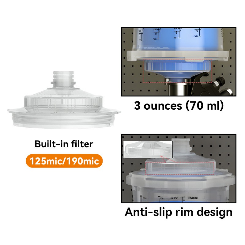 -С.1 Spray Cup Lid разполага с конструкция с двойно слой, която съдържа до 3 унции боя под филтъра. Капакът подобрява потока и консистенцията на боята, като същевременно намалява пръскането от началото до края.