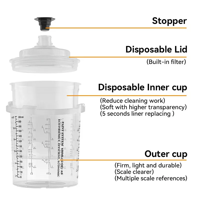 - Капакът за чаша за спрей за еднократна употреба AYS3.1 има двуслойна конструкция, която побира до 3 унции (70 ml) боя под филтъра. Капакът подобрява потока и консистенцията на боята, намалявайки пръскането на боя.