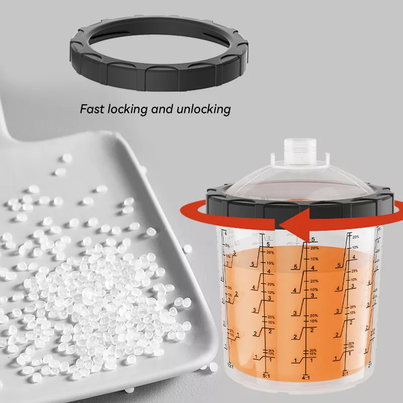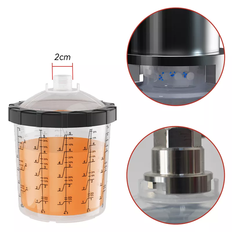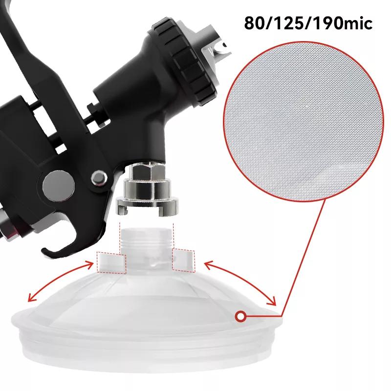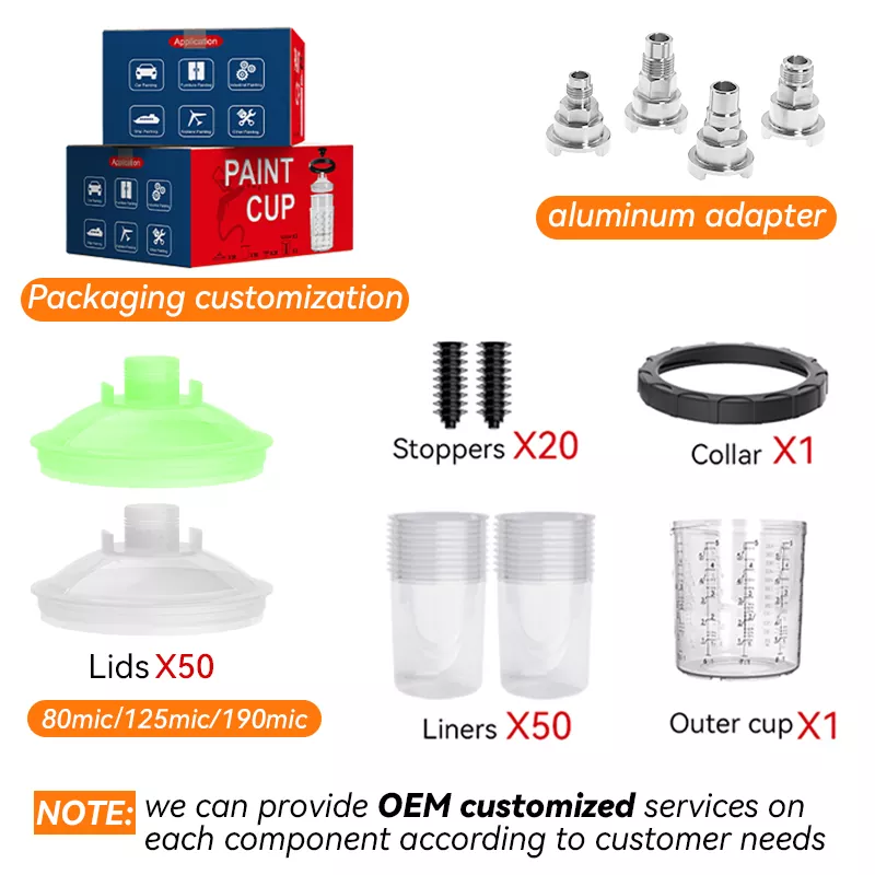 650ML Speedy Paint System 2.0 е нов тип система за чаши със спрей за боя за еднократна употреба. Една картонена кутия включва [1 външна чаша +1 яка +50 подложки +50 капаци +20 запушалки], поддържащи няколко цвята боя в едно приложение. За различни размери на частиците на боята се предлагат филтриращи мрежи от 80, 125 и 190 микрометра, което ви позволява да изберете подходящия филтър. Системата за чаши за спрей боя за еднократна употреба също може да функционира като единица за смесване и съхранение на боя, така че вече не е необходимо да използвате хартиени фунии и чаши за смесване, постигайки четири функции в едно: филтриране, смесване, пръскане и съхранение на боята. Ето защо ентусиастите по рисуване обичат този продукт толкова много.