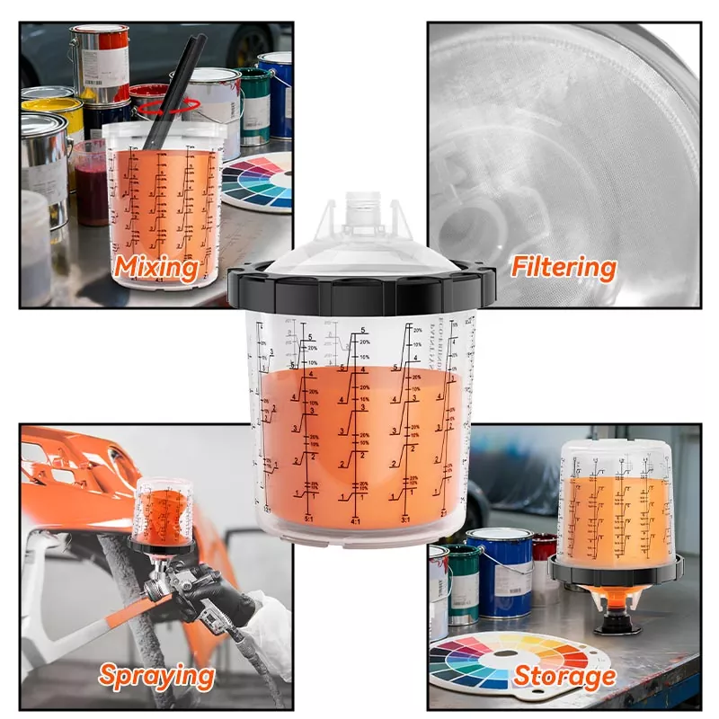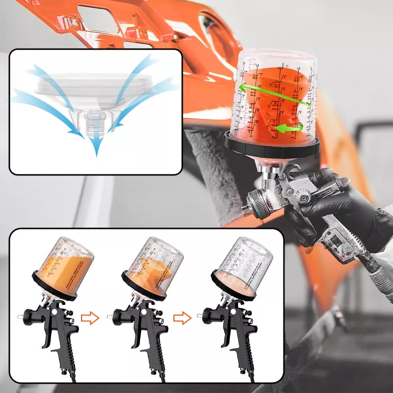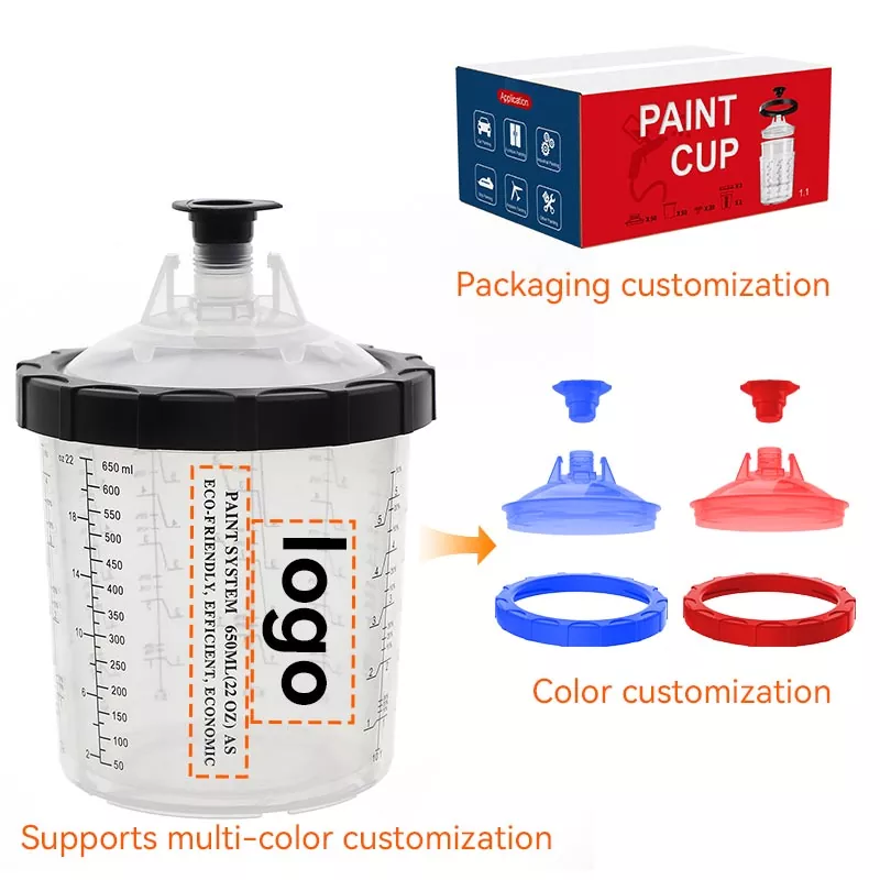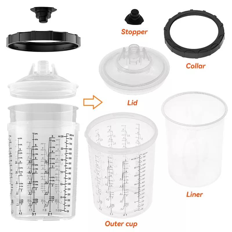 Системата за чаши за боя за еднократна употреба 800ML 1.0 прави смесването и пръскането на боя лесно и удобно, като същевременно опростява почистването и съхранението на боята. Няма повече прехвърляне на продукти в отделни контейнери - просто използвайтевътрешни чаши за еднократна употребаза смесване, пръскане и съхранение на различни цветове боя отделно, елиминирайки пръскането на боя. Разтворът за еднократна употреба на спрей чаша AYSPAT е предназначен за честа смяна на цвета, намалявайки времето за почистване и използването на разтворител.