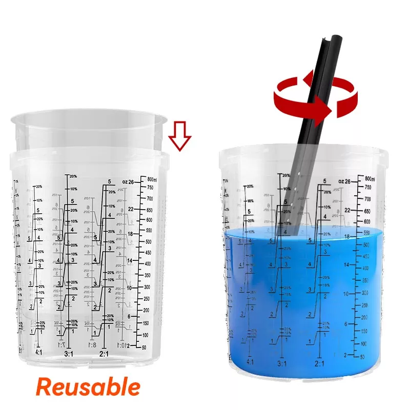 Външна чаша за многократна употреба със скала за съотношение на смесване. Поставете подложката за еднократна употреба във външната чаша и смесете боята директно в подложката. Намалете разходите за материали, като не използвате традиционна чаша за смесване.