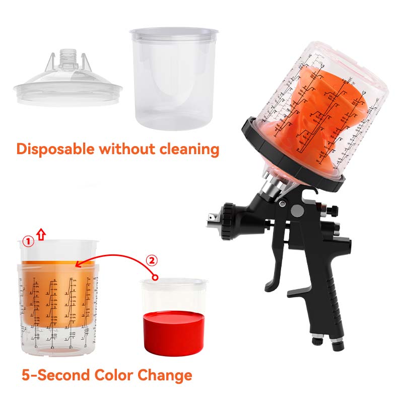 Theчаша за пистолет за еднократна употреба не изисква почистване след употреба; просто изхвърлете вътрешната чаша, за да промените бързо цветовете, намалявайки интервала за промяна на цвета от 20 минути на 5 секунди, ефективно удвоявайки дневното производство. Капакът разполага с вграден фин филтър за ефективно филтриране на примесите, осигурявайки равномерно и гладко пръскане, което води до по-висококачествено покритие.