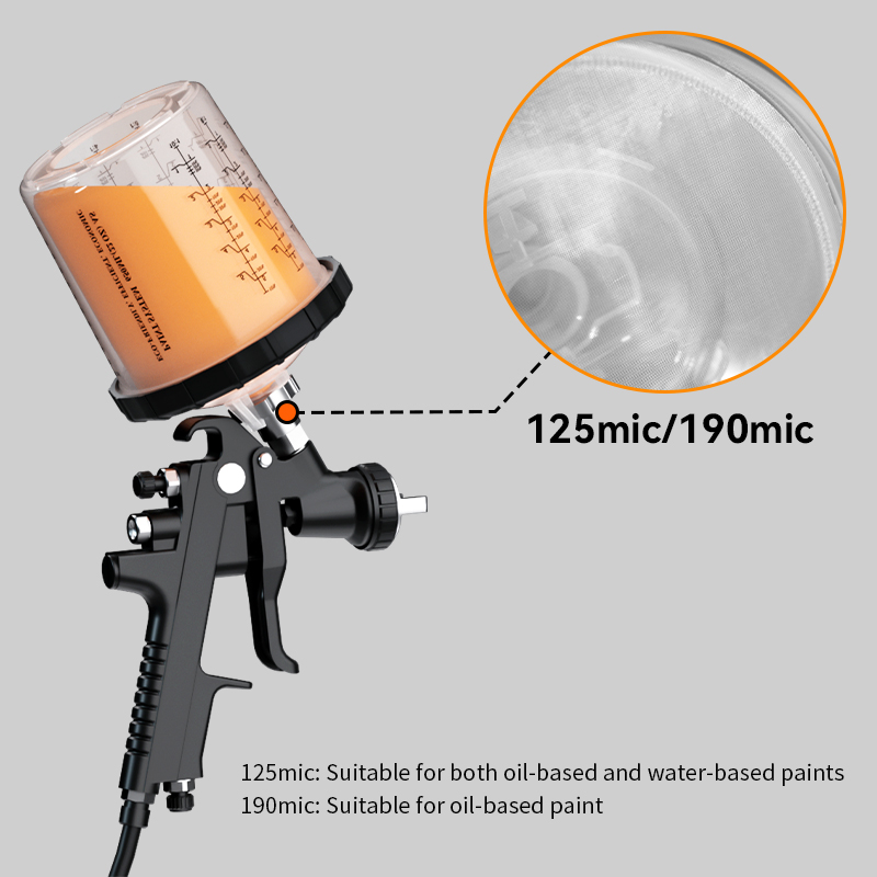 • Вградени интегрирани филтри за превъзходно покритие на боята: Капачката на чашата за спрей за еднократна употреба разполага с вградени филтри 190μ (боя на маслена основа) и 125μ (боя на водна основа), които ефективно филтрират примесите по време на пръскане и увеличават блясъка на боята с 20%.